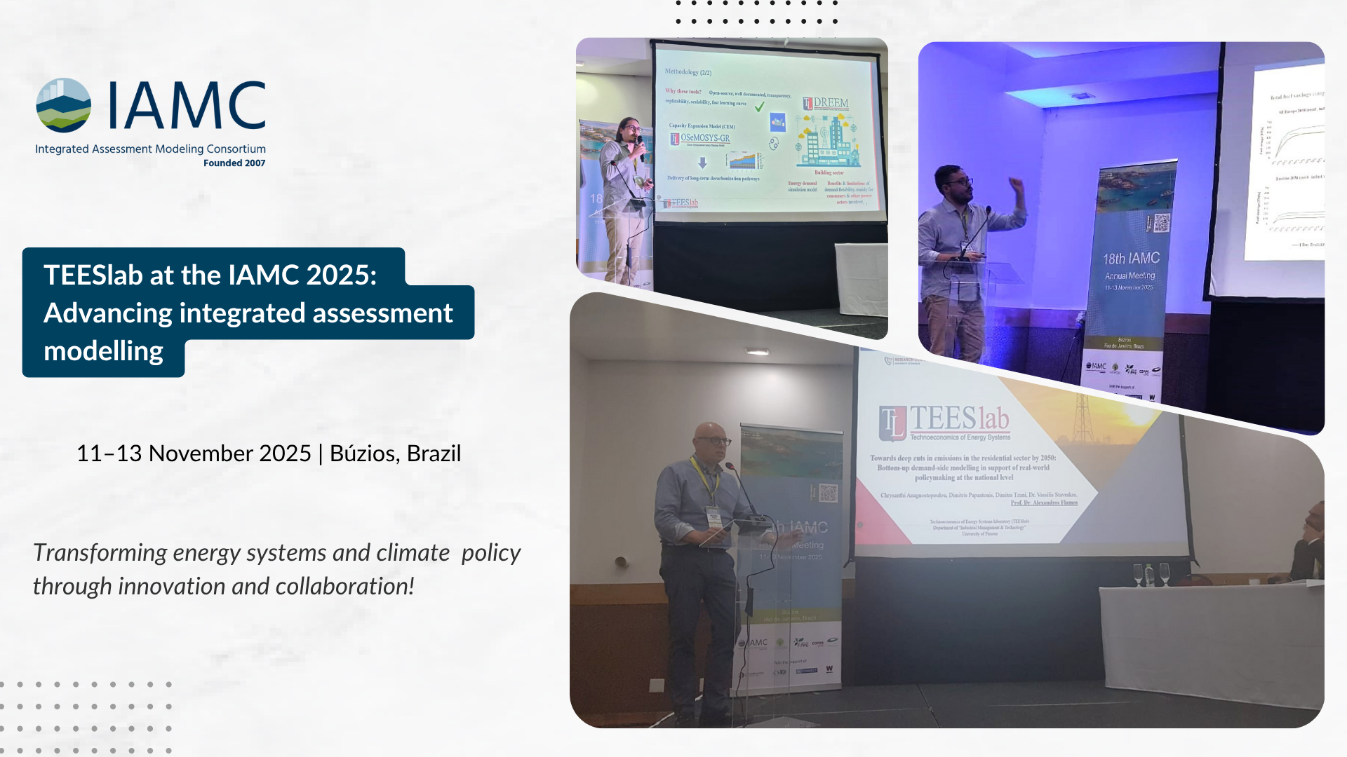 Our Technoeconomics of Energy Systems laboratory (TEESlab) participated in the 18th Annual Meeting of the Integrated Assessment Modeling Consortium (IAMC 2025), held on 1113 November 2025 in the municipality of Búzios, in Rio de Janeiro, Brazil. This year’s annual event brought together once again researchers from around the world to exchange knowledge and push the boundaries of climate, energy systems, and integrated assessment modelling, while, also, exchanging novel insights on the evolving priorities shaping future climate and energy research. Our team had a strong presence, contributing to sessions on national mitigation strategies, decarbonisation in the buildings sector, and equity and just transitions.